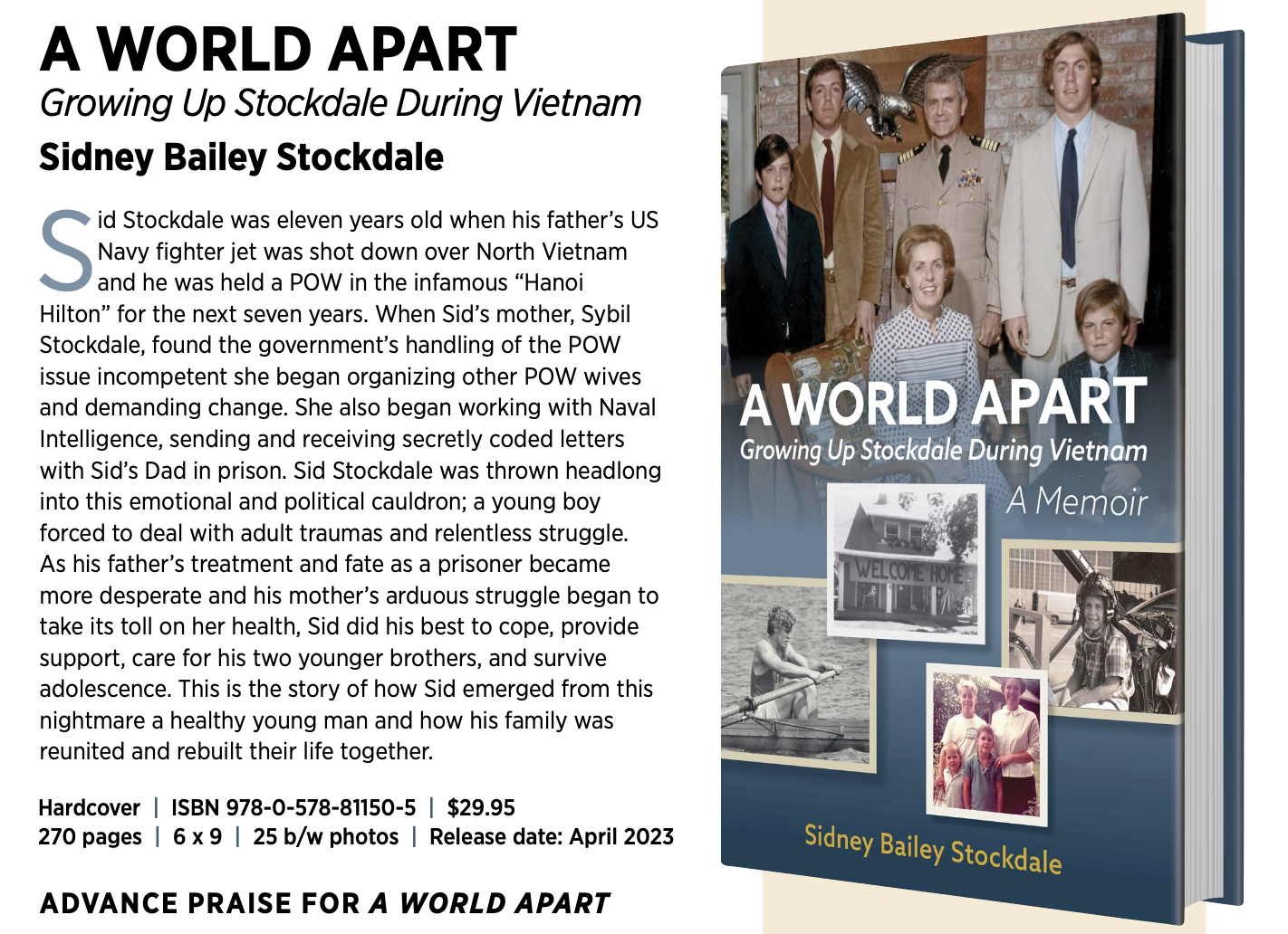 Sid Stockdale, class of 1973 is the son of distinguished military hero, James Bond Stockdale. Sid Stockdale was eleven years old when his father’s US Navy fighter jet was shot down over North Vietnam and he was held a POW in the infamous “Hanoi Hilton” for the next seven years. Sid authored a memoir, about his father and his time as a POW during Vietnam, titled A World Apart: Growing Up Stockdale During Vietnam.
