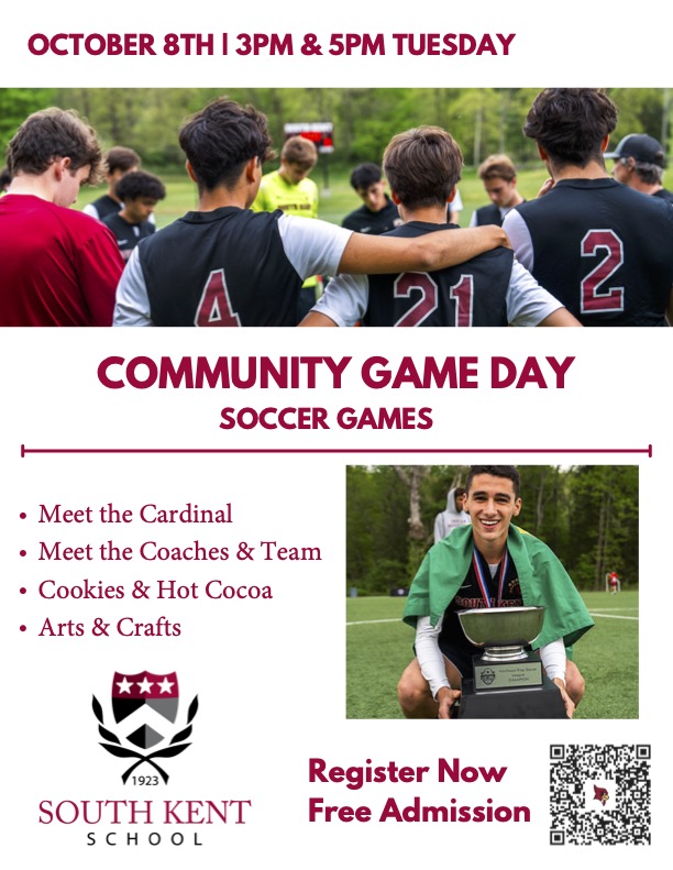 We invite all families to South Kent School’s Soccer Community Day on October 8th for a special afternoon of soccer, fun, and family-friendly activities! Come cheer on our South Kent Cardinals as they take on Hoosac School at 3:00 PM, and stay after the game for some exciting activities.